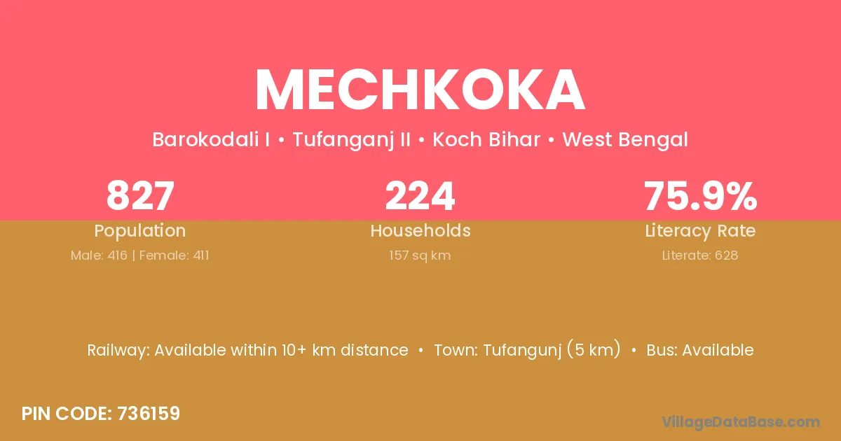 Tufangunj (5 km) is the nearest town to Mechkoka village for major economic activities and is located approximately 5 km away.
