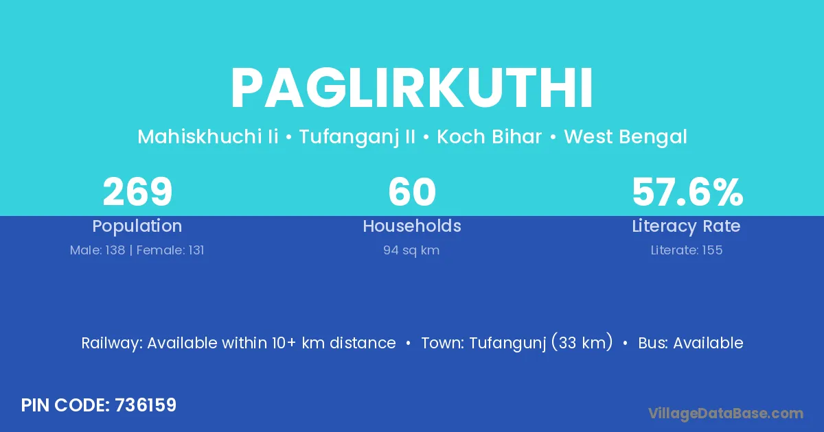 Tufangunj (33 km) is the nearest town to Paglirkuthi village for major economic activities and is located approximately 33 km away.