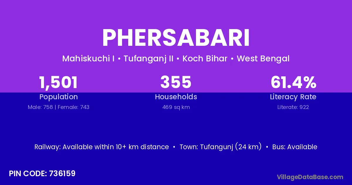 Tufangunj (24 km) is the nearest town to Phersabari village for major economic activities and is located approximately 24 km away.