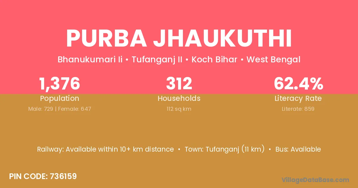 Tufanganj (11 km) is the nearest town to Purba Jhaukuthi village for major economic activities and is located approximately 11 km away.