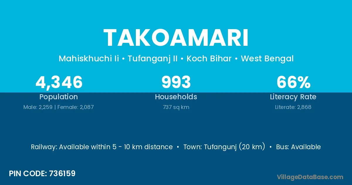 Tufangunj (20 km) is the nearest town to Takoamari village for major economic activities and is located approximately 20 km away.