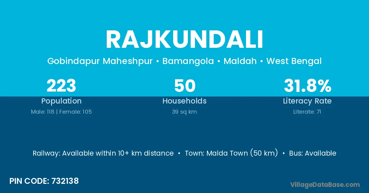 Malda Town (50 km) is the nearest town to Rajkundali village for major economic activities and is located approximately 50 km away.
