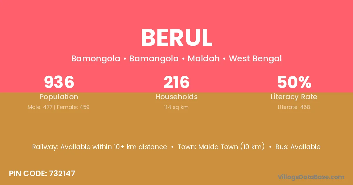 Malda Town (10 km) is the nearest town to Berul village for major economic activities and is located approximately 10 km away.