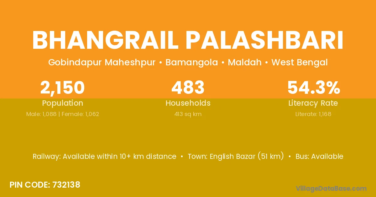 Bhangrail Palashbari village has a total population of 2,150 people, of which 1,088 are males and 1,062 are females.