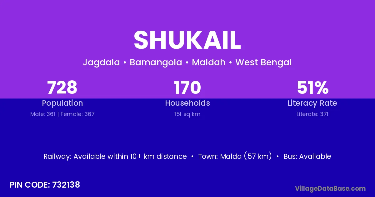 Malda (57 km) is the nearest town to Shukail village for major economic activities and is located approximately 57 km away.