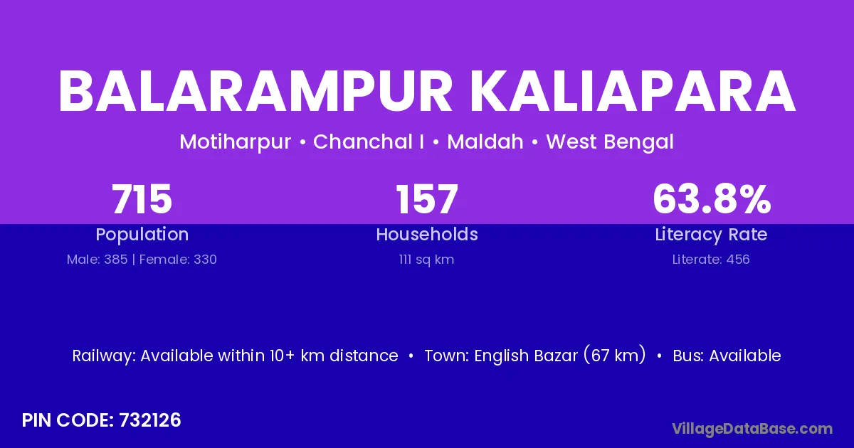 Balarampur Kaliapara village has a total population of 715 people, of which 385 are males and 330 are females.