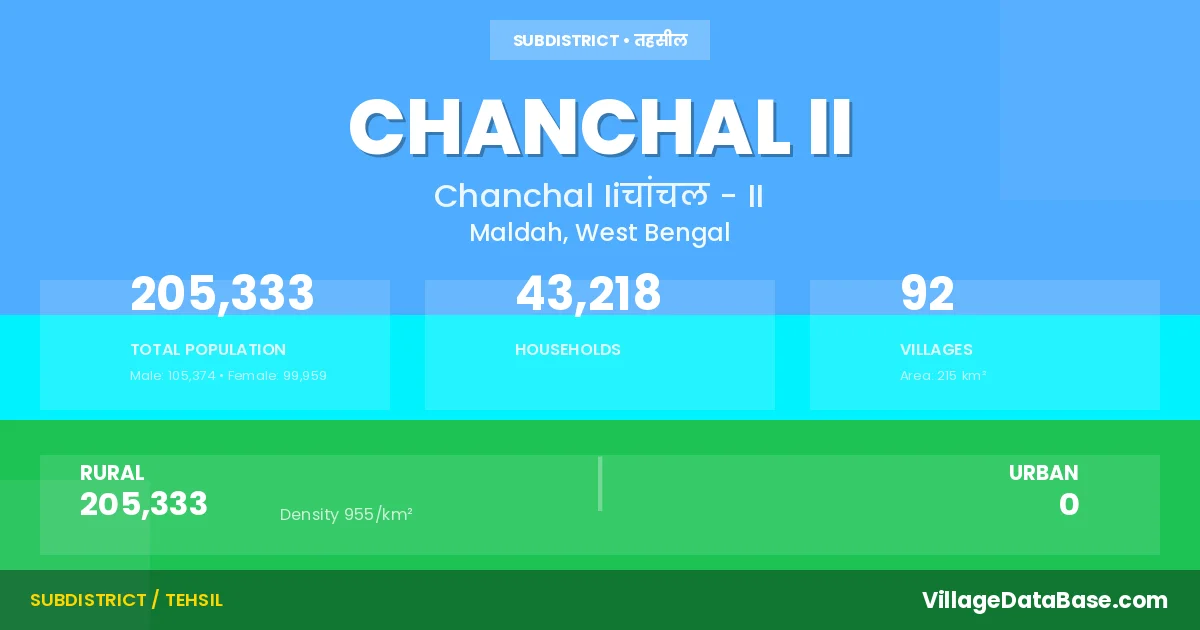 According to the 2011 census The total area of Chanchal II Subdivision is 215 km², with a population of 205333 people. The population density is 955 inhabitants per square kilometre, and there are approximately 43218 houses in the sub district.