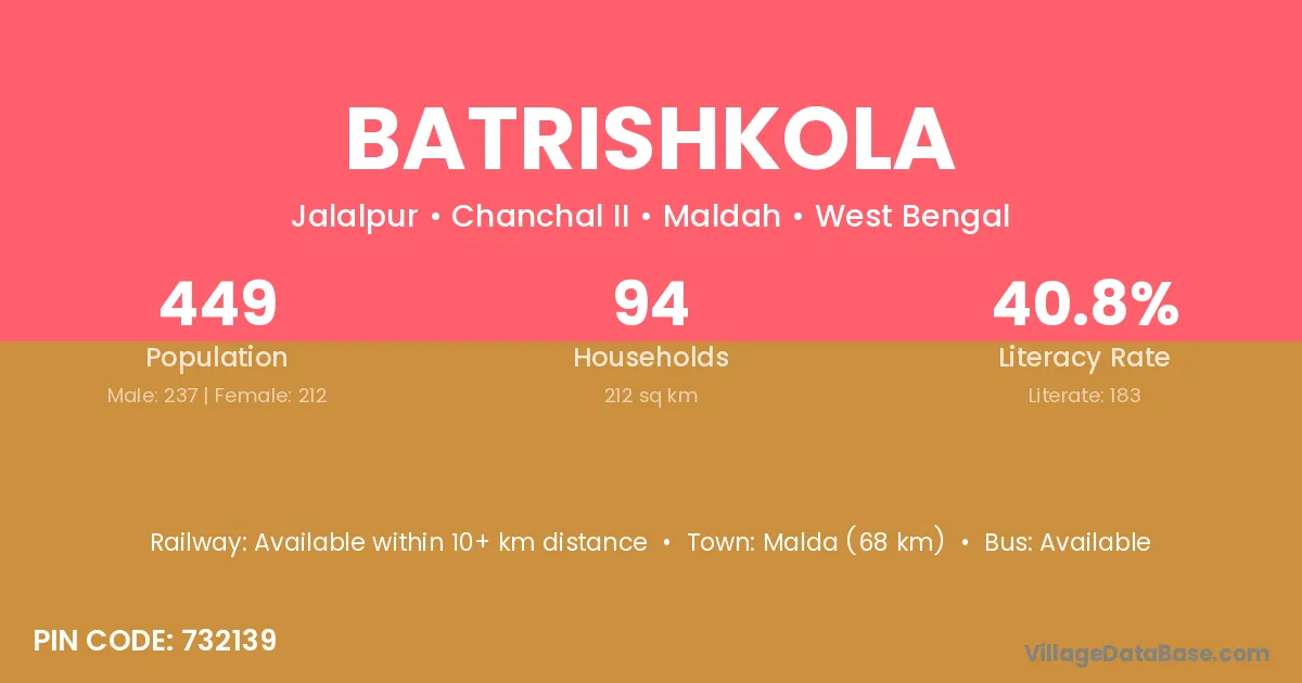 Malda (68 km) is the nearest town to Batrishkola village for major economic activities and is located approximately 68 km away.