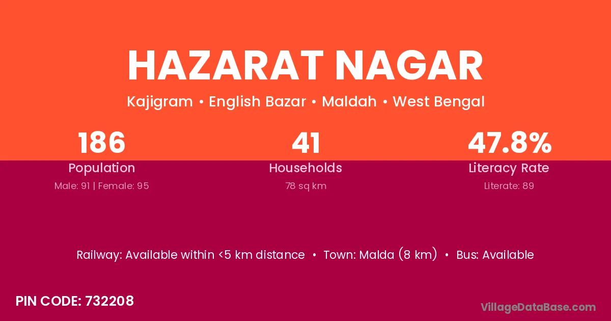 Malda (8 km) is the nearest town to Hazarat Nagar village for major economic activities and is located approximately 8 km away.