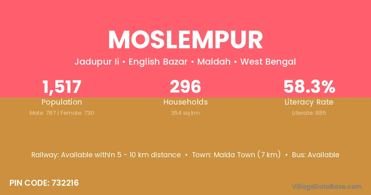 Malda Town (7 km) is the nearest town to Moslempur village for major economic activities and is located approximately 7 km away.