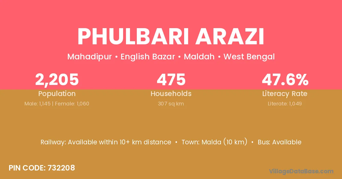 Malda (10 km) is the nearest town to Phulbari Arazi village for major economic activities and is located approximately 10 km away.