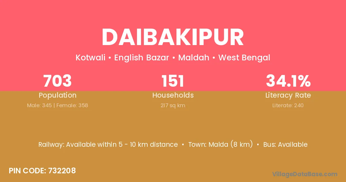 Malda (8 km) is the nearest town to Daibakipur village for major economic activities and is located approximately 8 km away.