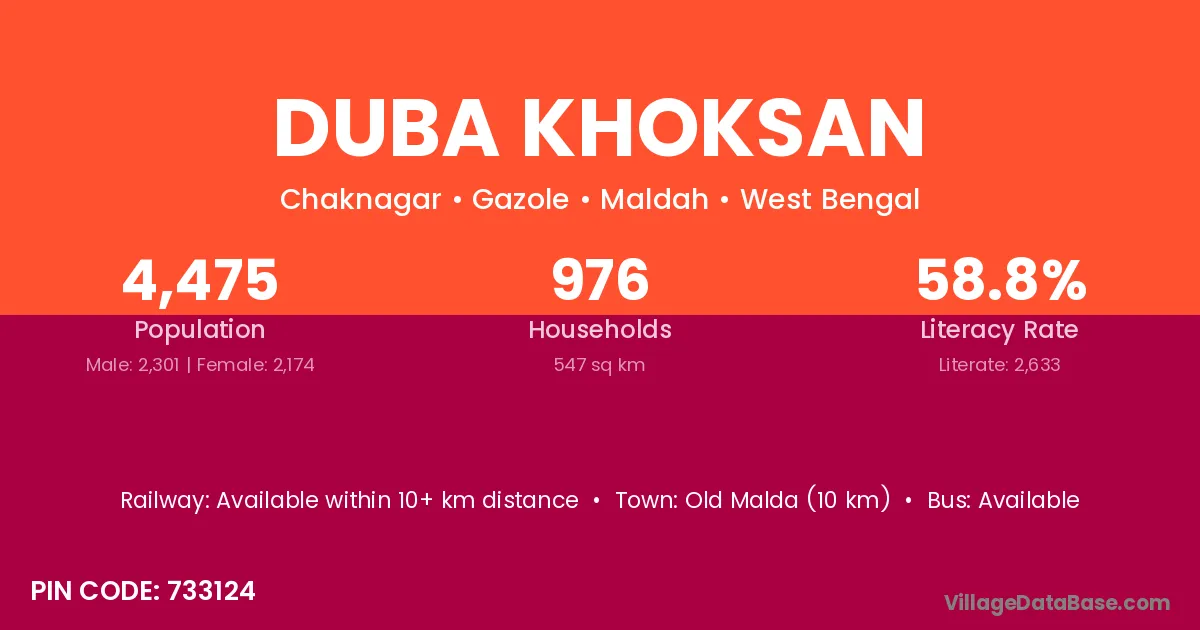 Old Malda (10 km) is the nearest town to Duba Khoksan village for major economic activities and is located approximately 10 km away.