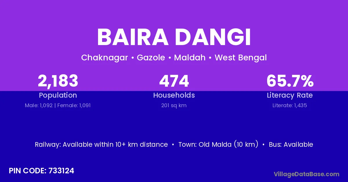 Old Malda (10 km) is the nearest town to Baira Dangi village for major economic activities and is located approximately 10 km away.