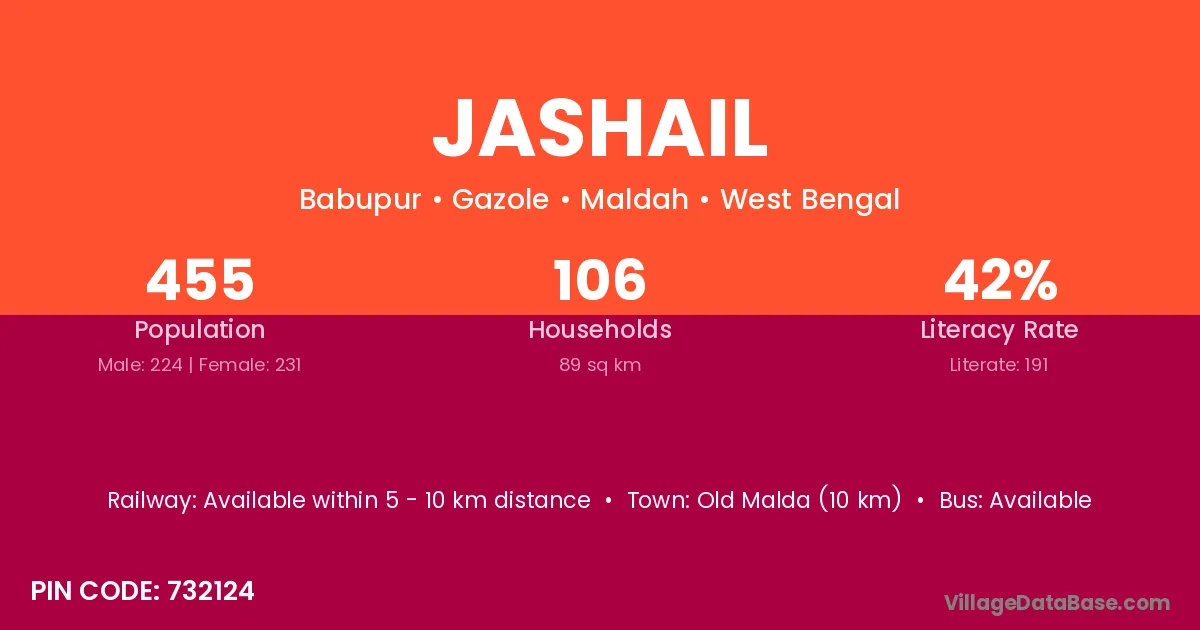 Old Malda (10 km) is the nearest town to Jashail village for major economic activities and is located approximately 10 km away.