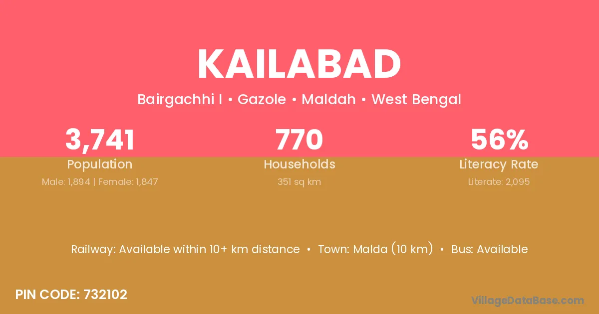 Malda (10 km) is the nearest town to Kailabad village for major economic activities and is located approximately 10 km away.