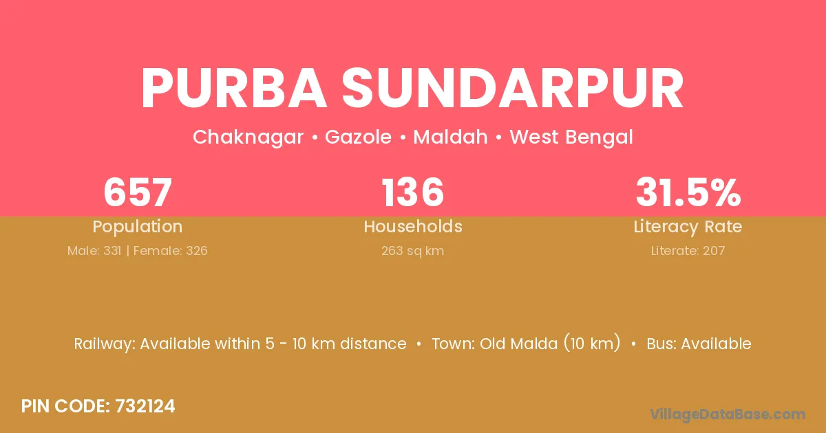 Old Malda (10 km) is the nearest town to Purba Sundarpur village for major economic activities and is located approximately 10 km away.