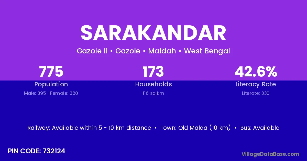 Old Malda (10 km) is the nearest town to Sarakandar village for major economic activities and is located approximately 10 km away.