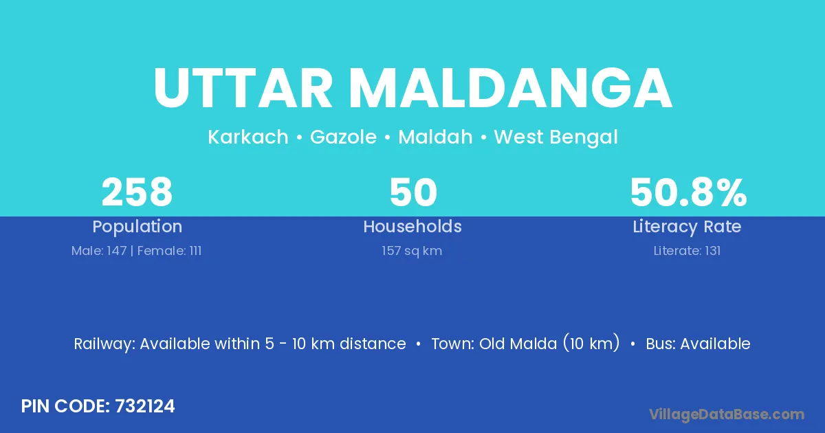 Old Malda (10 km) is the nearest town to Uttar Maldanga village for major economic activities and is located approximately 10 km away.