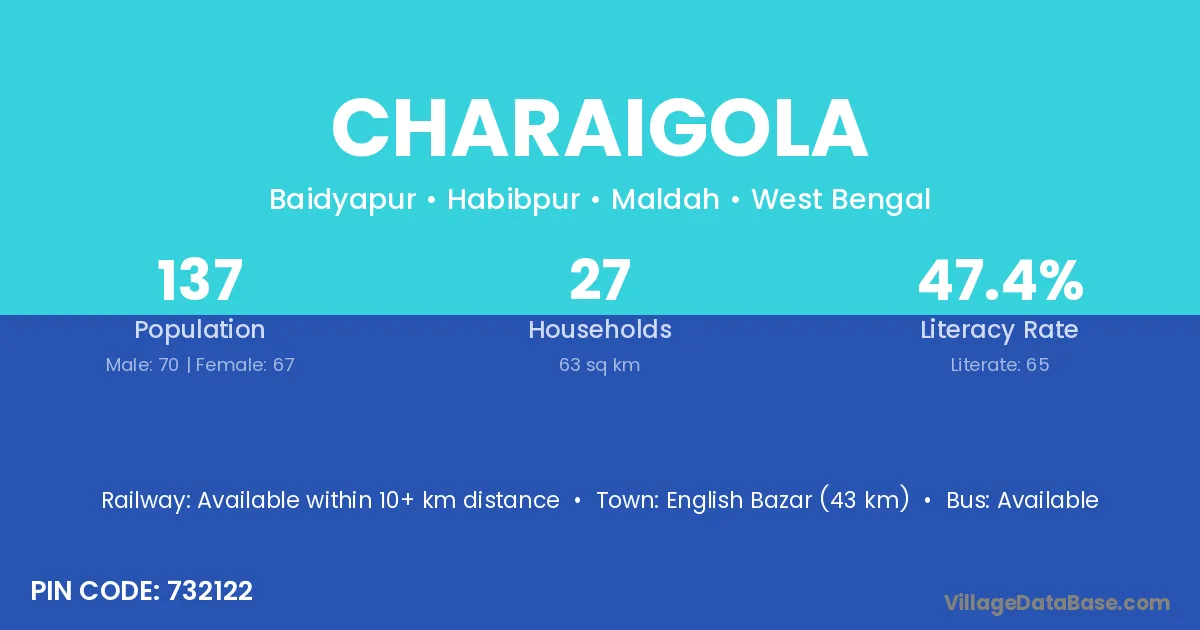 English Bazar (43 km) is the nearest town to Charaigola village for major economic activities and is located approximately 43 km away.