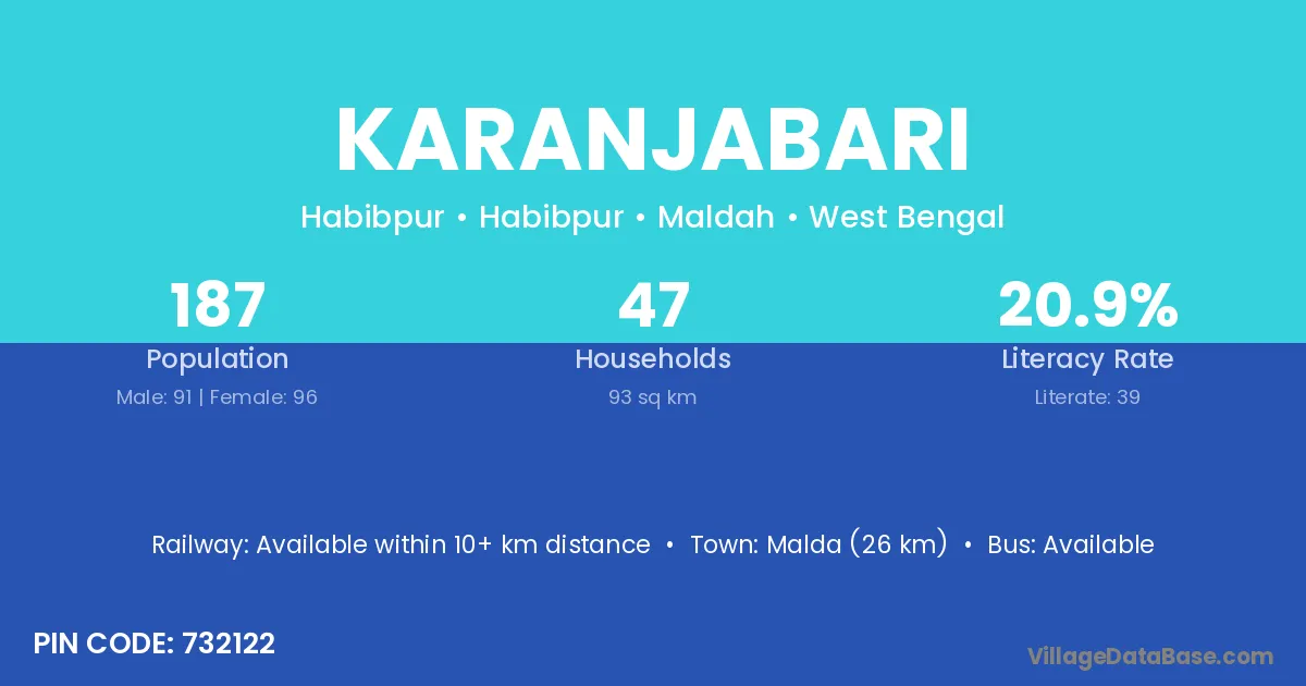 Malda (26 km) is the nearest town to Karanjabari village for major economic activities and is located approximately 26 km away.