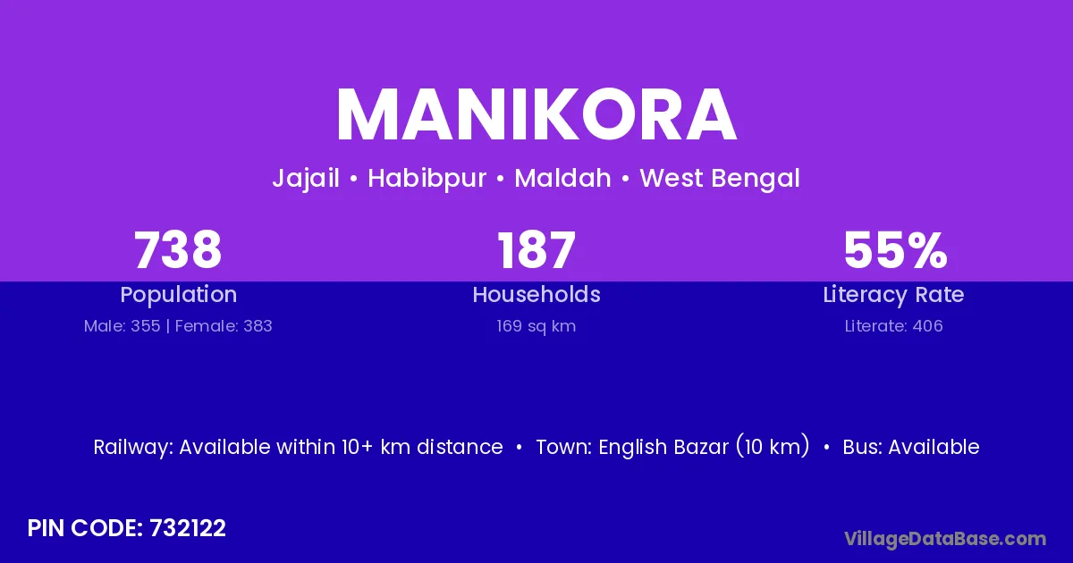 English Bazar (10 km) is the nearest town to Manikora village for major economic activities and is located approximately 10 km away.
