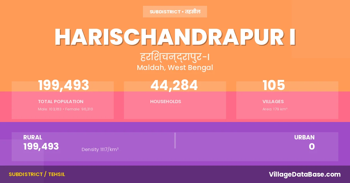 According to the 2011 census The total area of Harischandrapur I Subdivision is 179 km², with a population of 199493 people. The population density is 1,117 inhabitants per square kilometre, and there are approximately 44284 houses in the sub district.