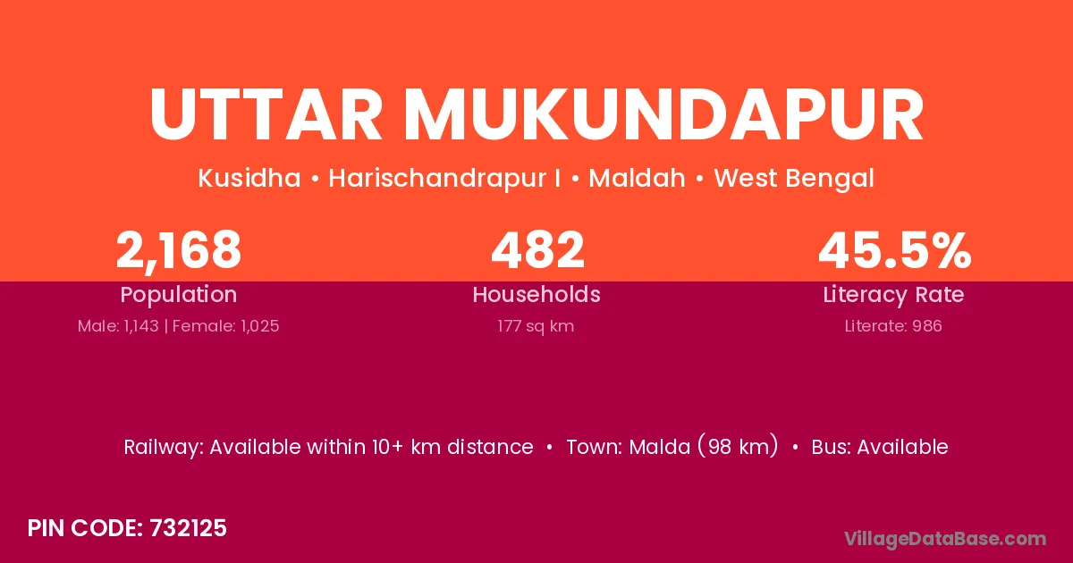 Malda (98 km) is the nearest town to Uttar Mukundapur village for major economic activities and is located approximately 98 km away.