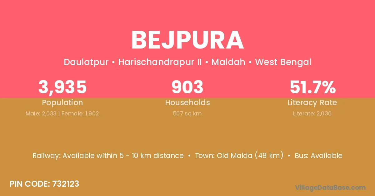 Old Malda (48 km) is the nearest town to Bejpura village for major economic activities and is located approximately 48 km away.