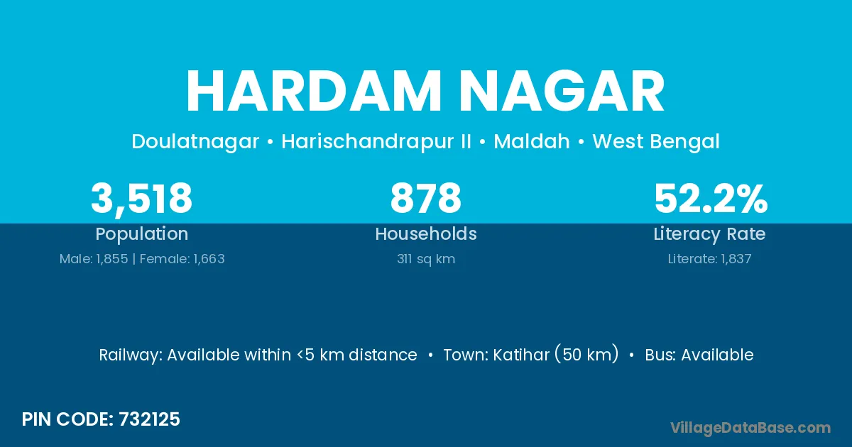 Katihar (50 km) is the nearest town to Hardam Nagar village for major economic activities and is located approximately 50 km away.