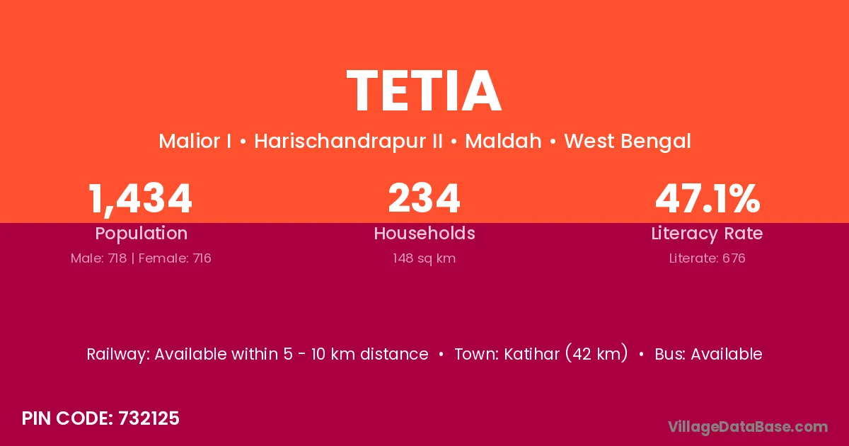 Katihar (42 km) is the nearest town to Tetia village for major economic activities and is located approximately 42 km away.