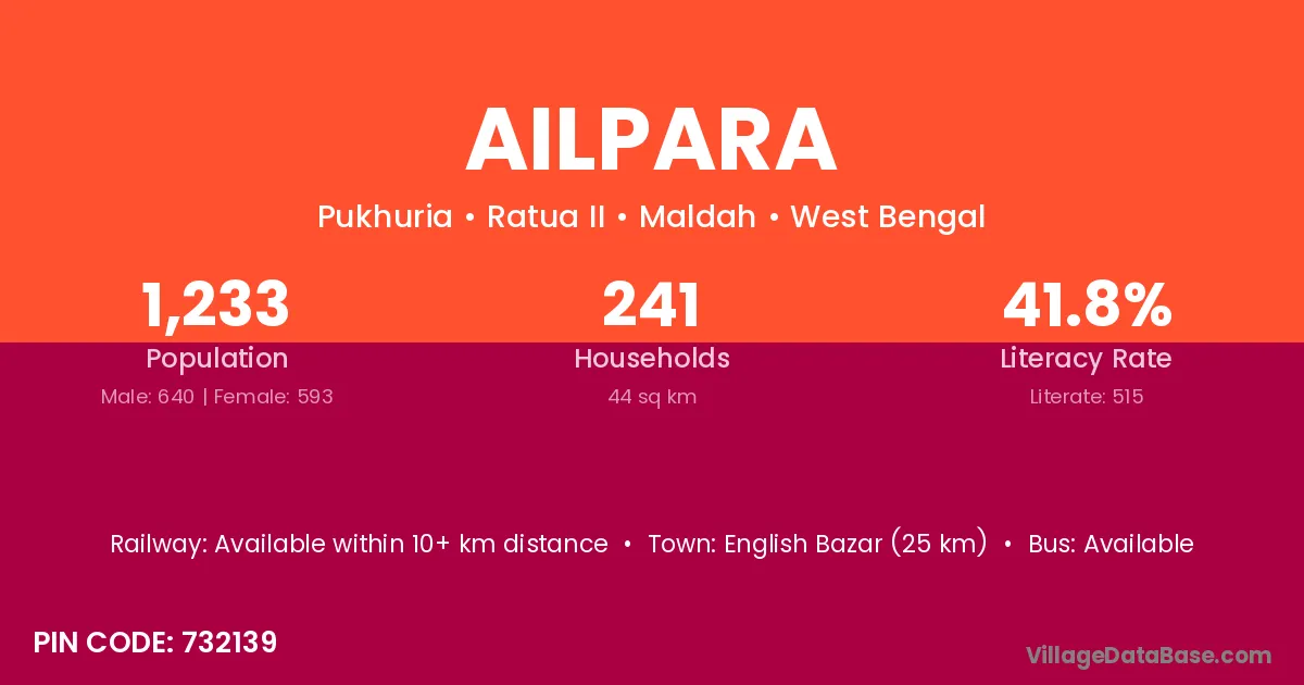 Malda (13 km) is the nearest town to Ailpara village for major economic activities and is located approximately 13 km away.