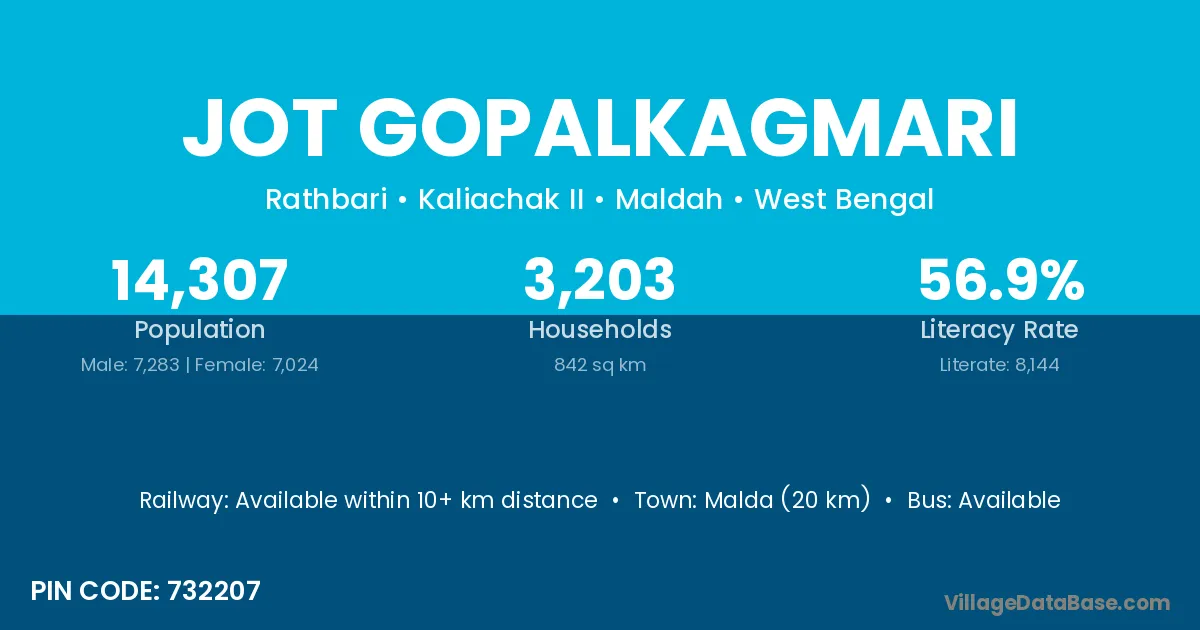 Malda (20 km) is the nearest town to Jot Gopalkagmari village for major economic activities and is located approximately 20 km away.
