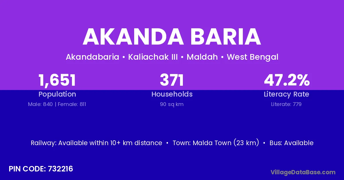 Malda Town (23 km) is the nearest town to Akanda Baria village for major economic activities and is located approximately 23 km away.