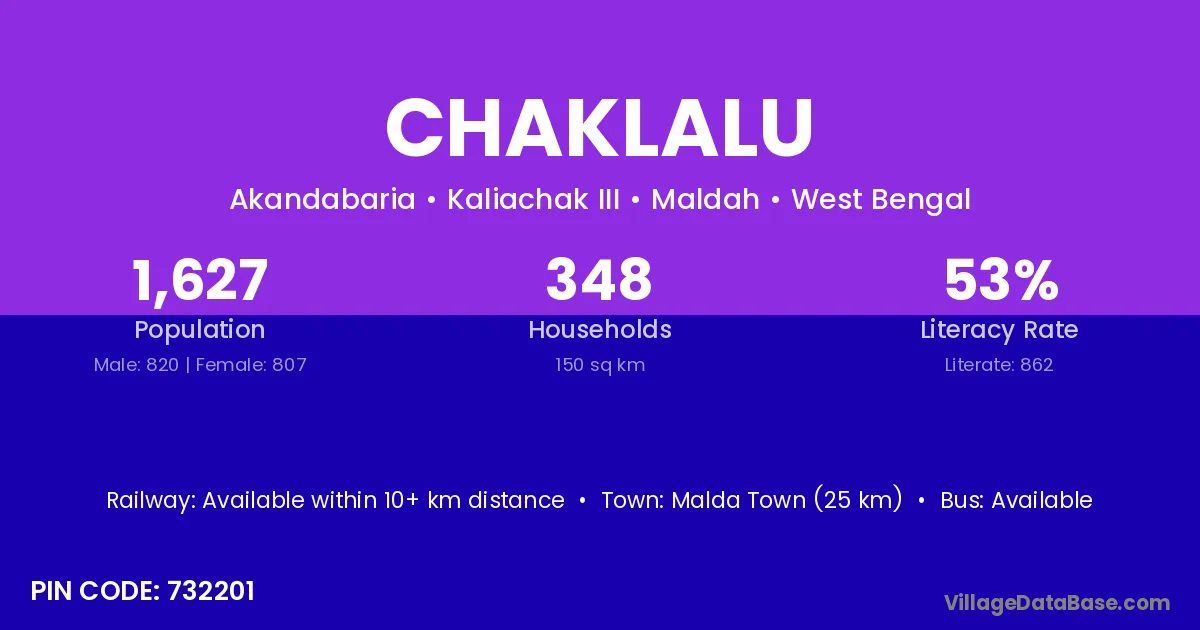 Malda Town (25 km) is the nearest town to Chaklalu village for major economic activities and is located approximately 25 km away.