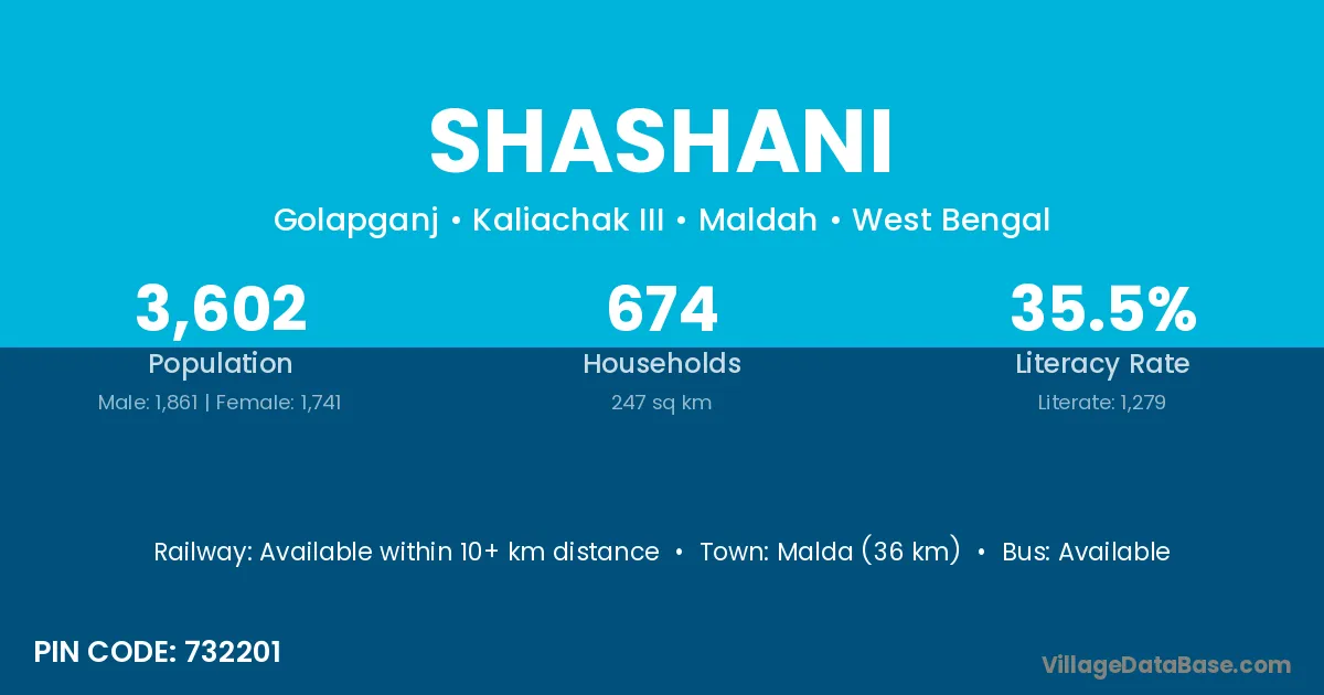 Malda (36 km) is the nearest town to Shashani village for major economic activities and is located approximately 36 km away.