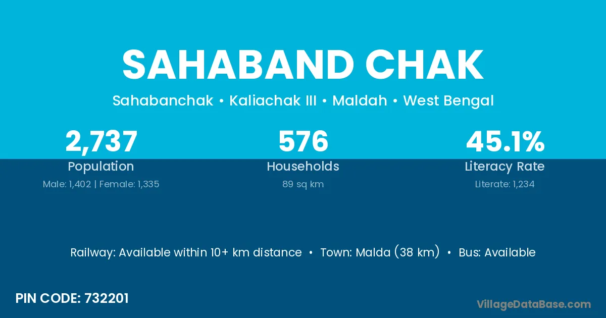 Malda (38 km) is the nearest town to Sahaband Chak village for major economic activities and is located approximately 38 km away.