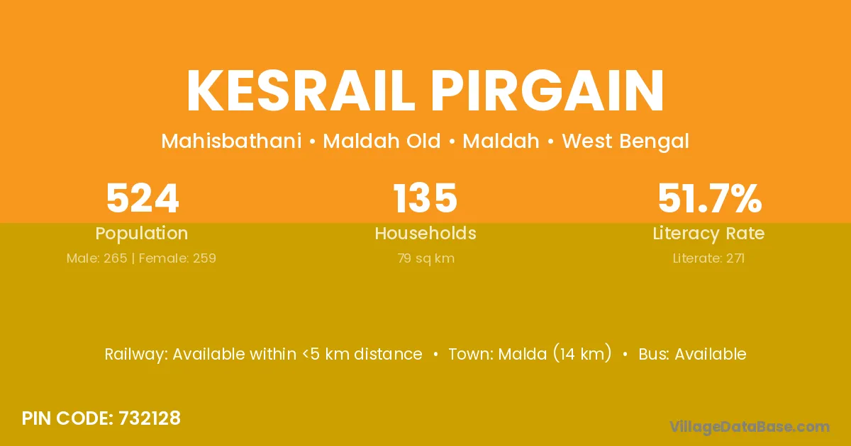 Malda (14 km) is the nearest town to Kesrail Pirgain village for major economic activities and is located approximately 14 km away.