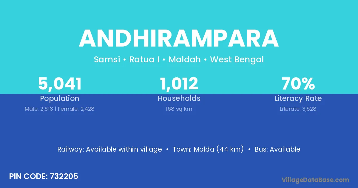 Malda (44 km) is the nearest town to Andhirampara village for major economic activities and is located approximately 44 km away.