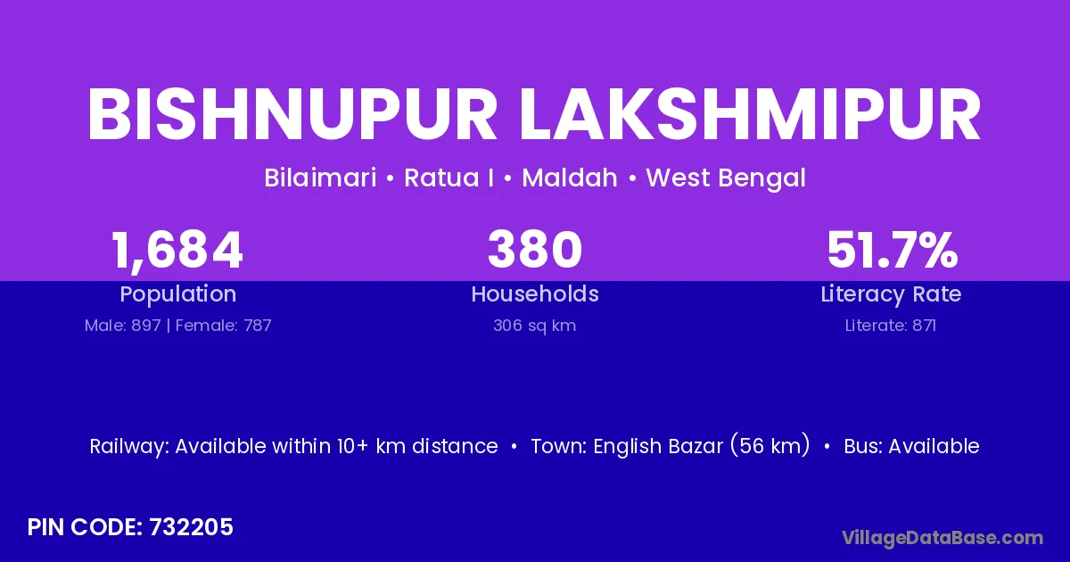 English Bazar (56 km) is the nearest town to Bishnupur Lakshmipur village for major economic activities and is located approximately 56 km away.