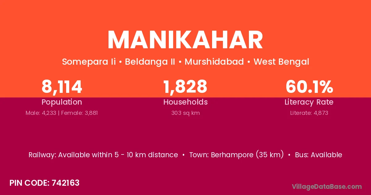 Berhampore (35 km) is the nearest town to Manikahar village for major economic activities and is located approximately 35 km away.