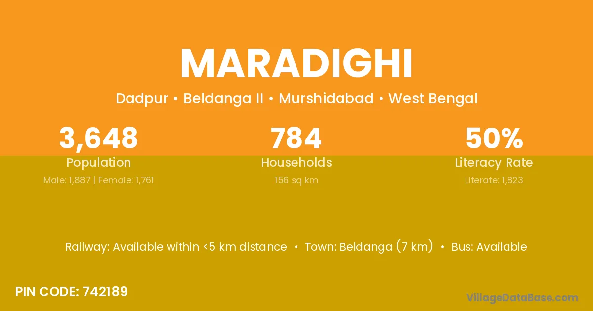 Beldanga (7 km) is the nearest town to Maradighi village for major economic activities and is located approximately 7 km away.