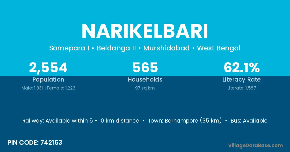 Berhampore (35 km) is the nearest town to Narikelbari village for major economic activities and is located approximately 35 km away.