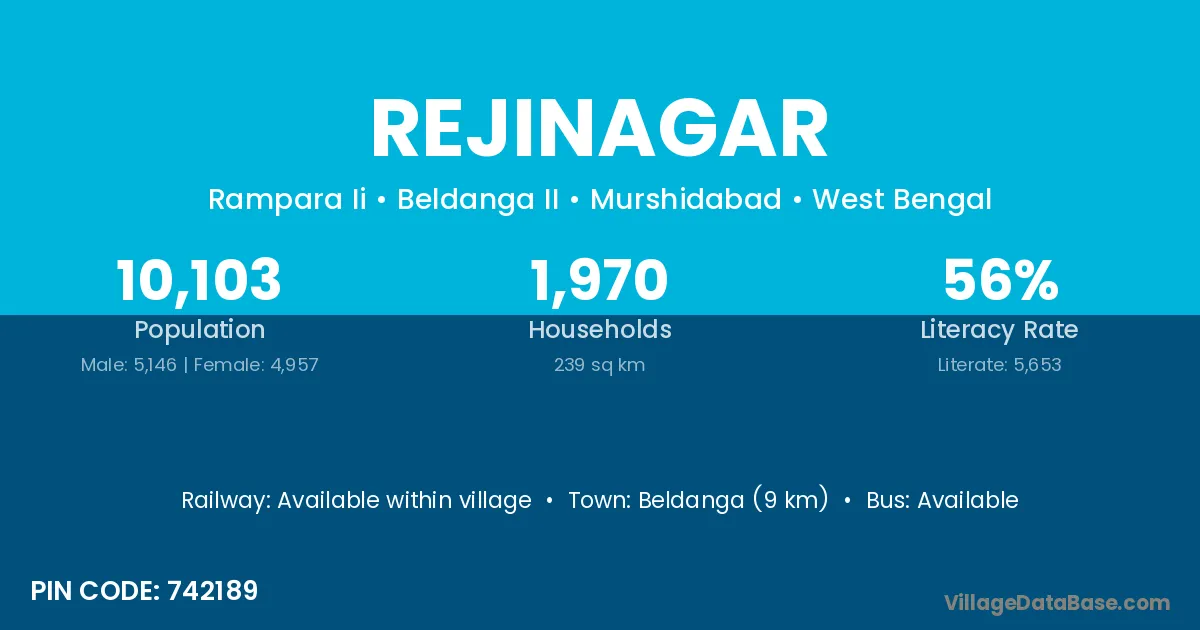 Beldanga (9 km) is the nearest town to Rejinagar village for major economic activities and is located approximately 9 km away.