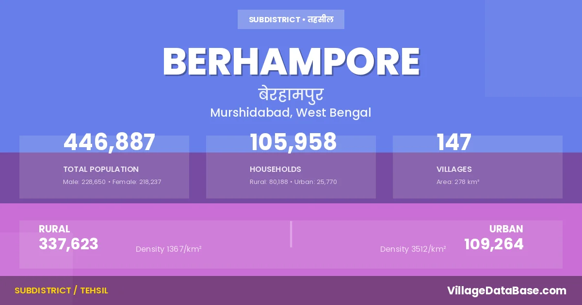 According to the 2011 census The total area of Berhampore Subdivision is 278 km², with a population of 446887 people. The population density is 1,607 inhabitants per square kilometre, and there are approximately 105958 houses in the sub district.