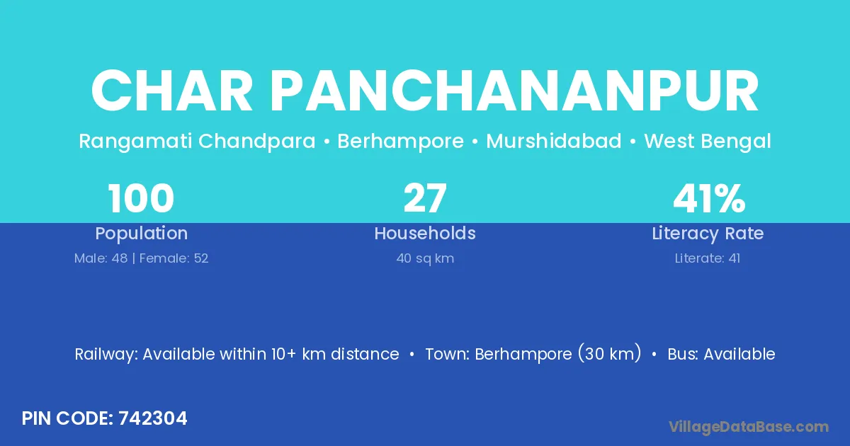 Berhampore (30 km) is the nearest town to Char Panchananpur village for major economic activities and is located approximately 30 km away.