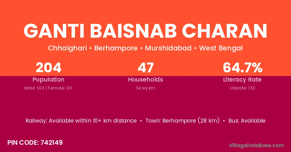 Berhampore (28 km) is the nearest town to Ganti Baisnab Charan village for major economic activities and is located approximately 28 km away.