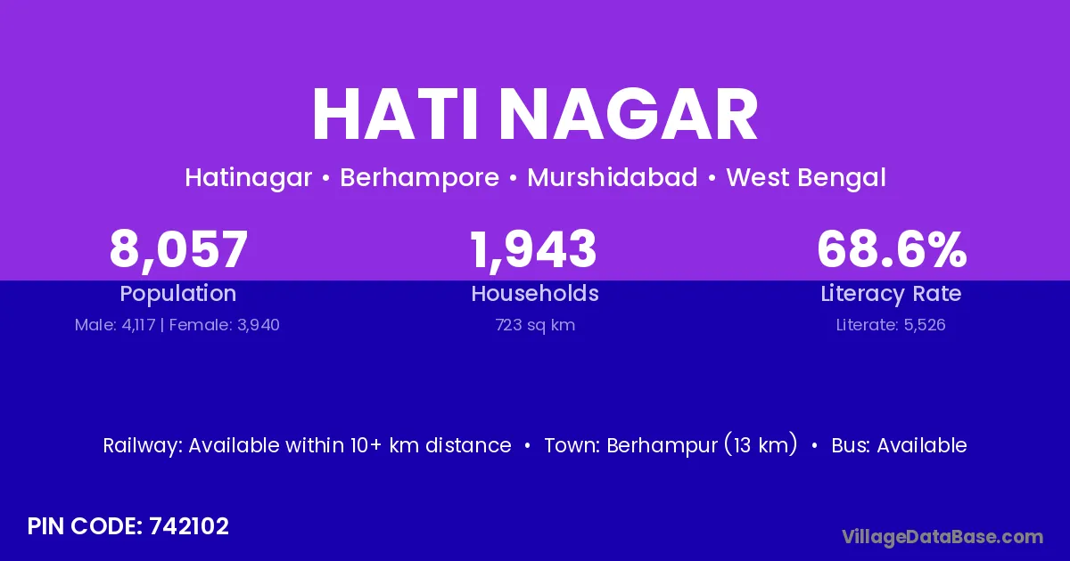 Berhampur (13 km) is the nearest town to Hati Nagar village for major economic activities and is located approximately 13 km away.