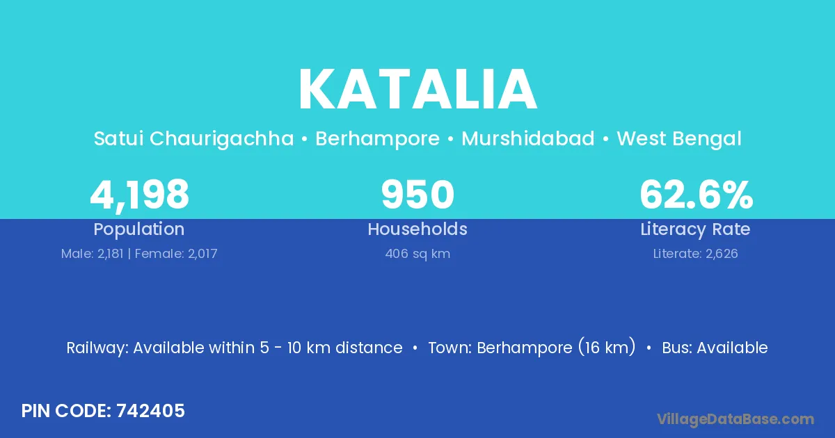 Berhampore (16 km) is the nearest town to Katalia village for major economic activities and is located approximately 16 km away.