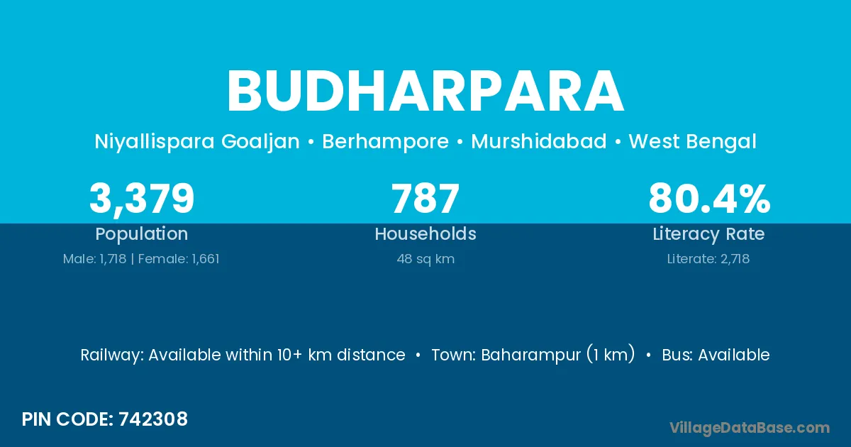 Baharampur (1 km) is the nearest town to Budharpara village for major economic activities and is located approximately 1 km away.